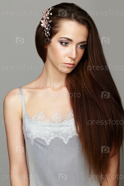 Портрет красоты молодой женщины. Брюнетка с брошью в длинных волосах и дневным женским макияжем на сером фоне