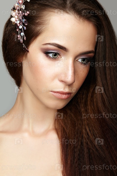 Портрет красоты молодой женщины. Брюнетка с брошью в длинных волосах и дневным женским макияжем на сером фоне