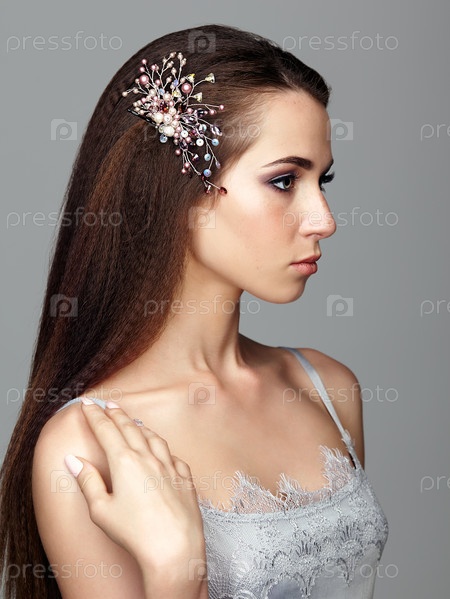 Портрет красоты молодой женщины. Брюнетка с брошью в длинных волосах и дневным женским макияжем на сером фоне
