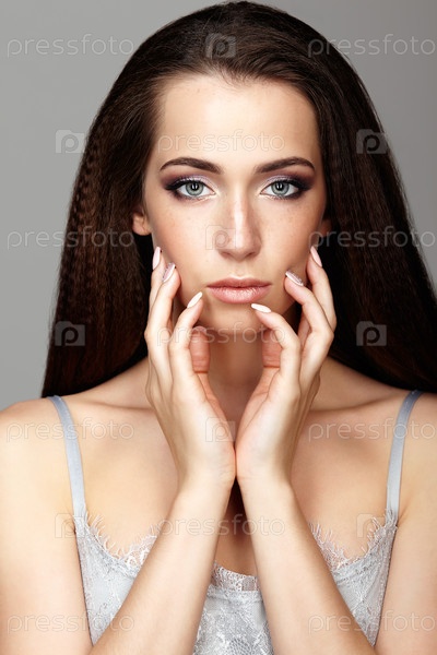 Портрет красоты молодой женщины, касающейся лица пальцами. Брюнетка с длинными волосами и дневным женским макияжем на сером фоне