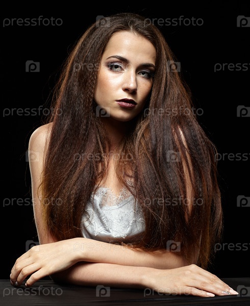 Портрет красоты молодой женщины сидит за черным столом. Брюнетка с длинными волосами и вечерним женским макияжем на темном фоне