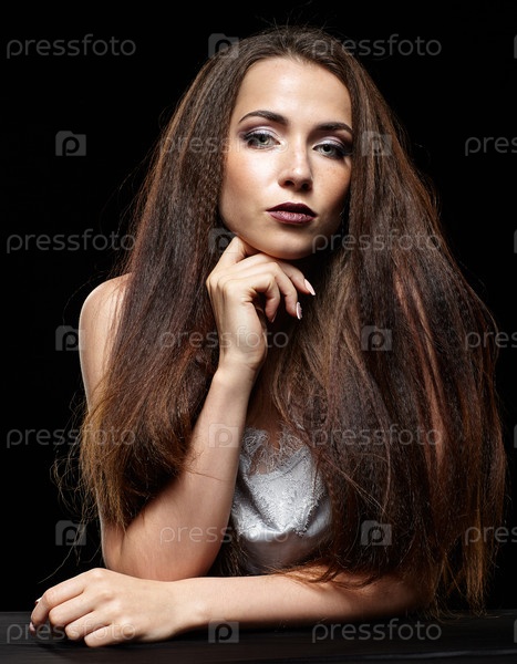 Портрет красоты молодой женщины сидит за черным столом. Брюнетка с длинными волосами и вечерним женским макияжем на темном фоне