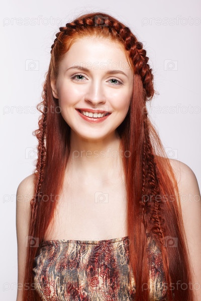 Молодая счастливая улыбающаяся рыжая женщина на белом