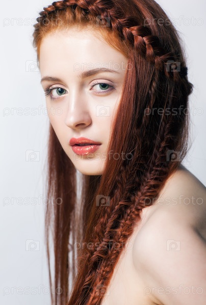Молодая женщина с рыжими косичками на белом фоне