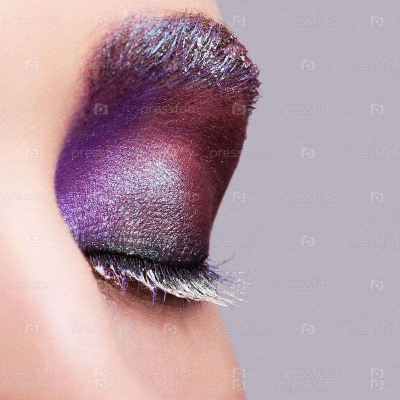 Женский закрытый глаз с вечерними фиолетово-пурпурными тенями для глаз и белым макияжем ресниц