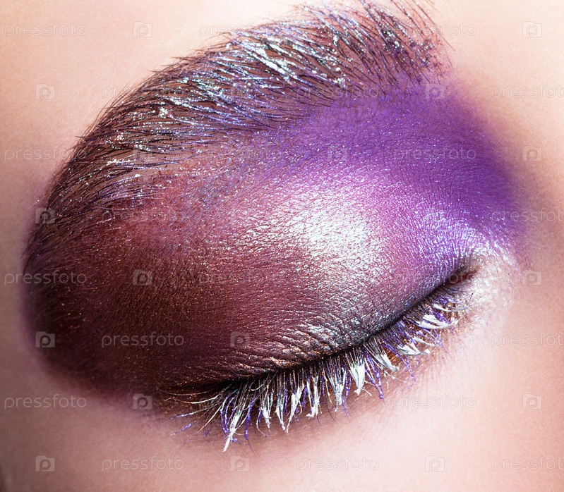 Женский закрытый глаз с вечерними фиолетово-пурпурными тенями для глаз и белым макияжем ресниц