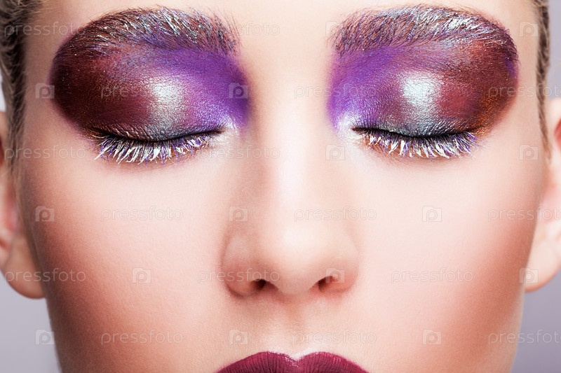Женский закрытый глаз с вечерними фиолетовыми тенями, белыми ресницами и фиолетовым макияжем губ