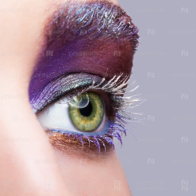 Женская зона вокруг глаз и брови с вечерним фиолетовым макияжем