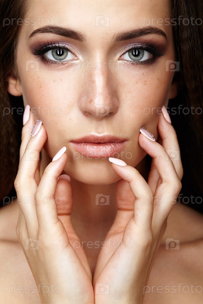 Портрет красоты молодой женщины, касающейся лица пальцами. Брюнетка с длинными волосами и дневным женским макияжем
