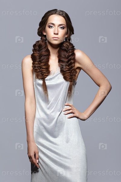 Портрет красоты молодой женщины в ночнушке. Брюнетка с длинными косами и дневным женским макияжем на сером фоне