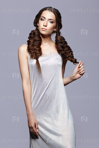 Портрет красоты молодой женщины в пеньюаре. Брюнетка с длинными косами и дневным женским макияжем на сером фоне