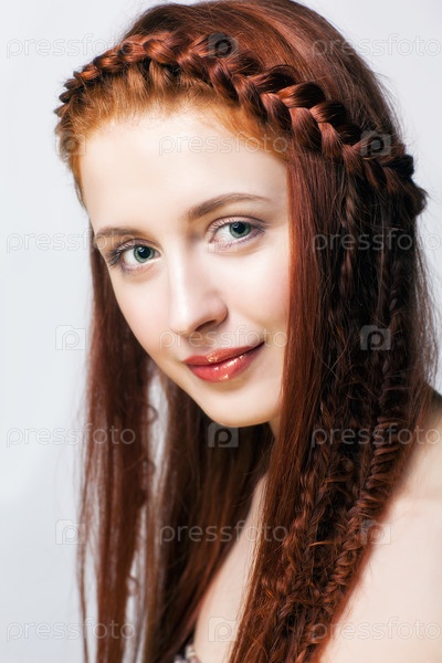 Молодая женщина с рыжими косичками на белом фоне