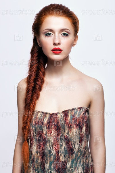 Молодая женщина с рыжими косичками на белом фоне