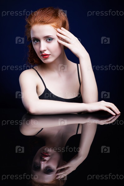 Молодая женщина с рыжими волосами над зеркалом отражения на синем фоне