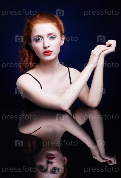 Молодая женщина с рыжими волосами над зеркалом отражения на синем фоне