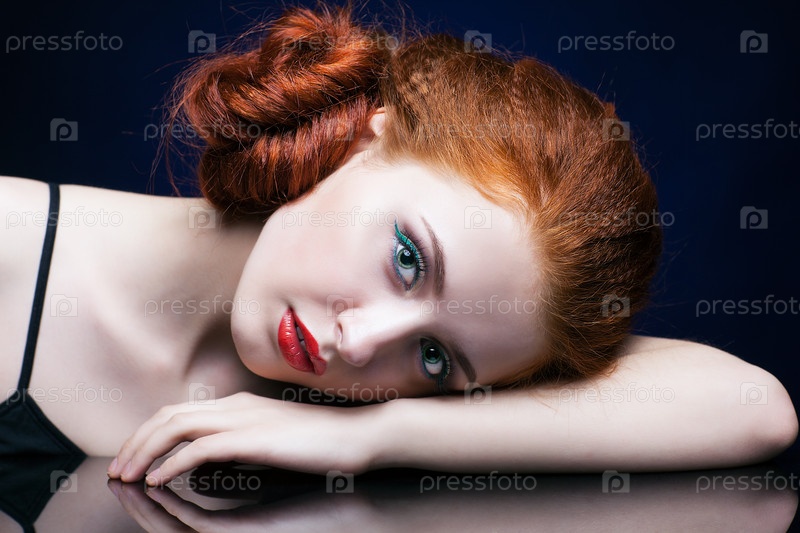Молодая женщина с рыжими волосами над зеркалом отражения на синем фоне