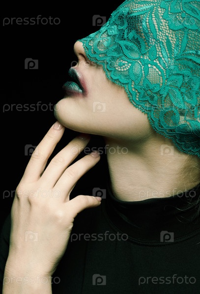 Хэллоуин красота портрет молодой красивой женщины с зеленой кружевной лентой на глазах на черном