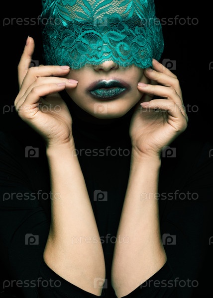 Хэллоуин красота портрет молодой красивой женщины с зеленой кружевной лентой на глазах на черном