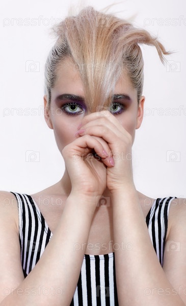 Портрет молодой красивой женщины с дымчатыми глазами зеленого фисташкового цвета с прядью волос в руках