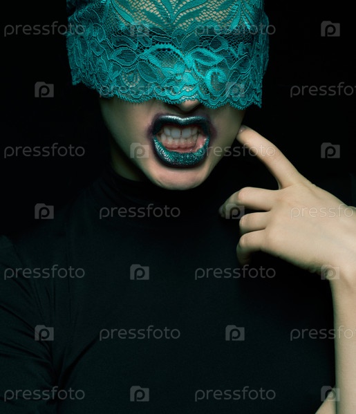 Хэллоуин красота портрет молодой красивой женщины с зеленой кружевной лентой на глазах на черном
