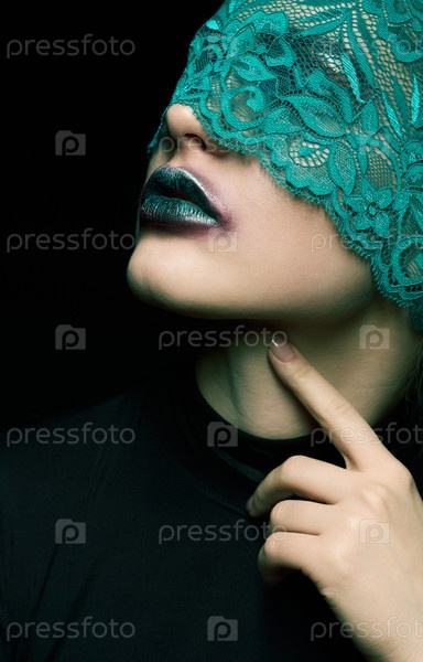 Хэллоуин красота портрет молодой красивой женщины с зеленой кружевной лентой на глазах на черном