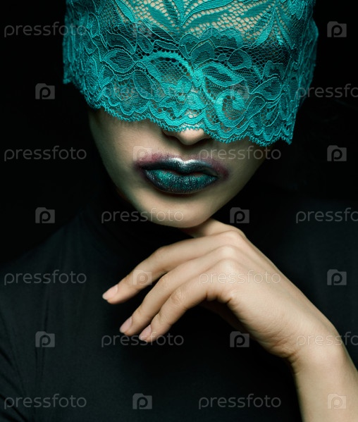 Хэллоуин красота портрет молодой красивой женщины с зеленой кружевной лентой на глазах на черном