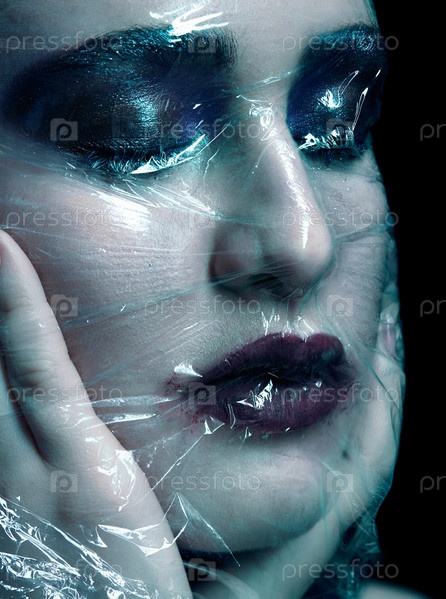 Портрет красоты на Хэллоуин молодой женщины, покрытой полиэтиленовой пленкой