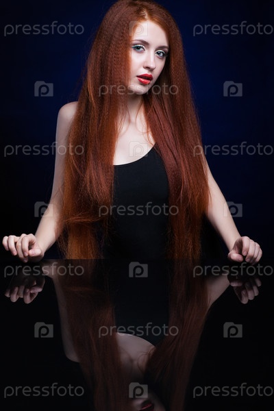 Молодая женщина с рыжими волосами над зеркалом отражения на синем фоне
