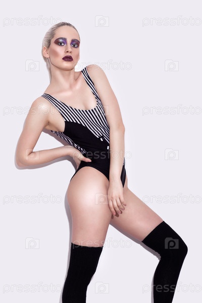Портрет молодой красивой женщины, одетой в полосатый купальник, позирующей у стены