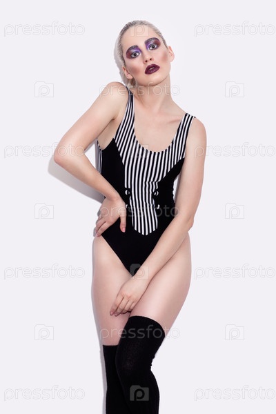 Портрет молодой красивой женщины, одетой в полосатый купальник, позирующей у стены