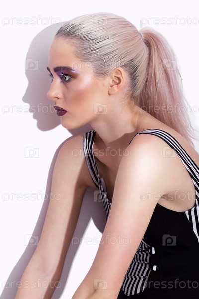 Портрет молодой красивой женщины с зелеными фисташковыми дымчатыми глазами в полосатом купальнике, позирующей у стены