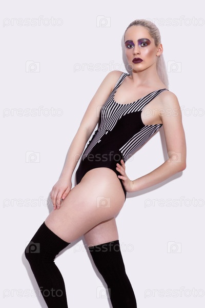 Портрет молодой красивой женщины, одетой в полосатый купальник, позирующей у стены