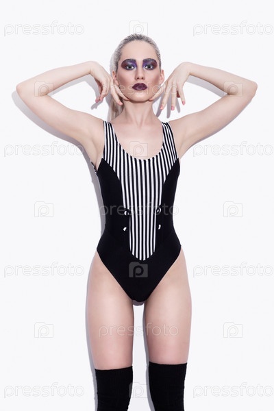 Портрет молодой красивой женщины, одетой в полосатый купальник, позирующей у стены