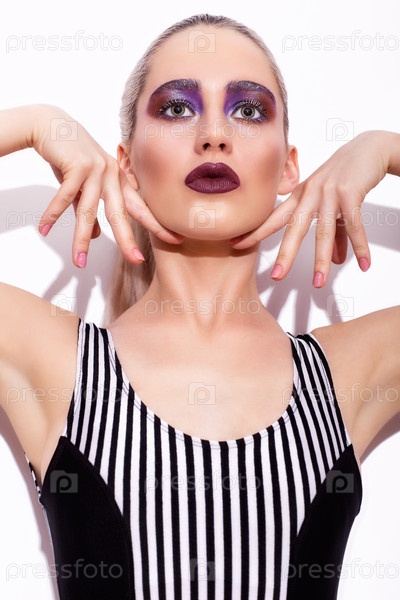 Портрет молодой красивой женщины с зелеными фисташковыми дымчатыми глазами в полосатом купальнике, позирующей у стены