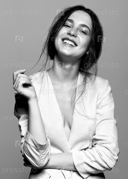 Портрет счастливой улыбающейся молодой брюнетки в белой модной женской куртке