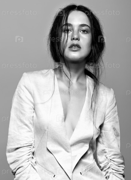 Портрет красивой молодой брюнетки в белой модной женской куртке
