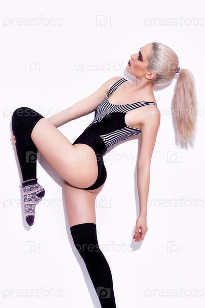Портрет молодой красивой женщины, одетой в полосатый купальник, позирующей у стены