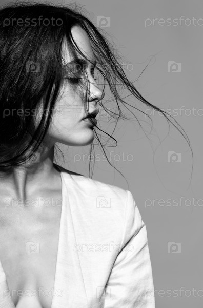 Портрет красивой молодой брюнетки в белой модной женской куртке