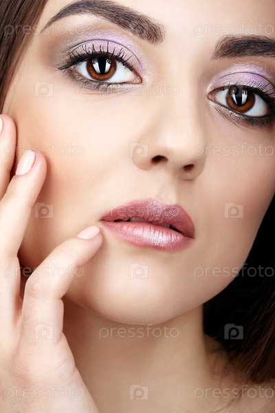 Крупным планом портрет большеглазой молодой брюнетки с рукой возле лица