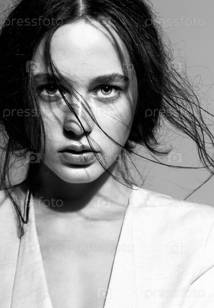 Портрет красивой молодой брюнетки в белой модной женской куртке