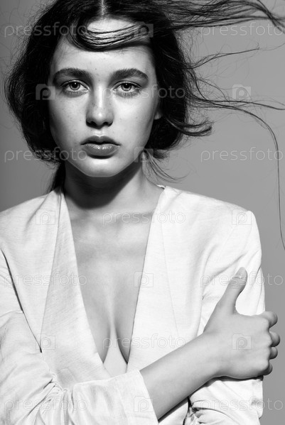 Портрет красивой молодой брюнетки в белой модной женской куртке