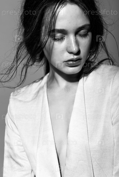 Портрет красивой молодой брюнетки в белой модной женской куртке