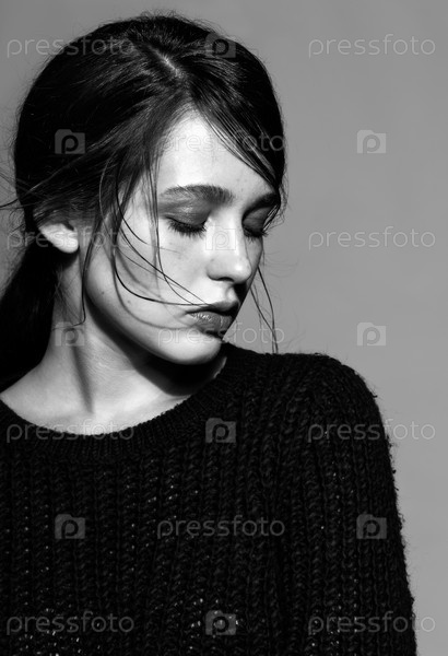 Портрет красивой молодой брюнетки в черном модном женском пуловере