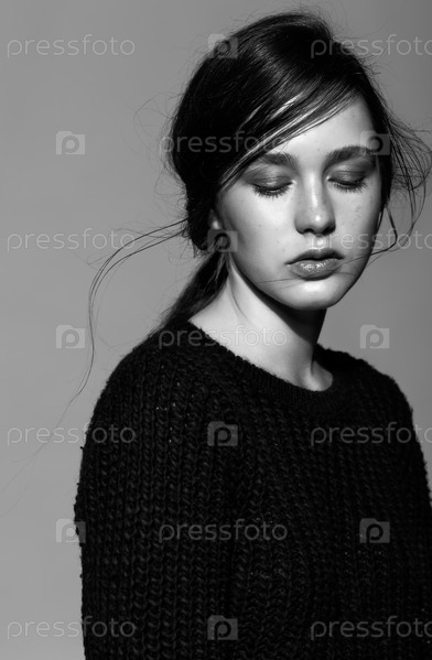 Портрет красивой молодой брюнетки в черном модном женском пуловере