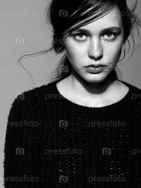 Портрет красивой молодой брюнетки в черном модном женском пуловере
