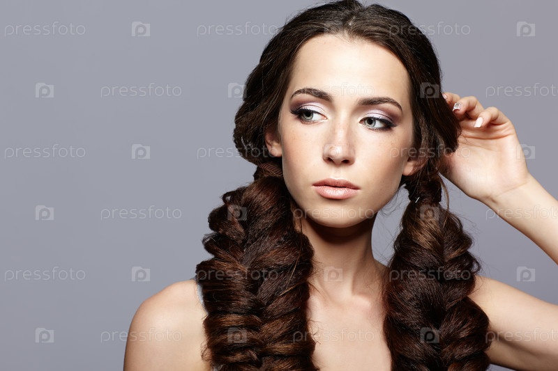 Портрет красоты молодой женщины в ночнушке. Брюнетка с длинными косами и дневным женским макияжем на сером фоне