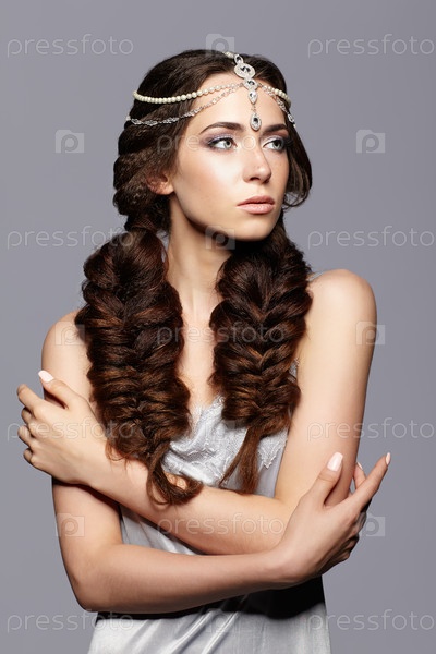 Портрет красоты молодой женщины с диадемой. Брюнетка с длинными косами и дневным женским макияжем на сером фоне
