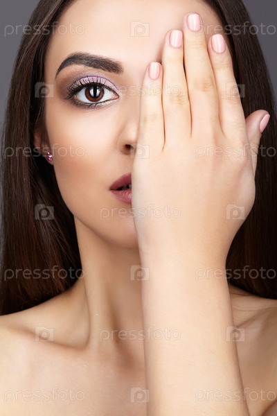 Крупным планом портрет большеглазой молодой брюнетки с рукой возле лица