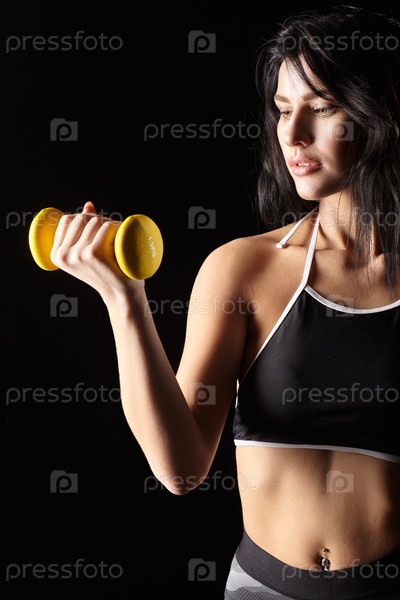 Портрет молодой спортивной брюнетки с гантелью в руке