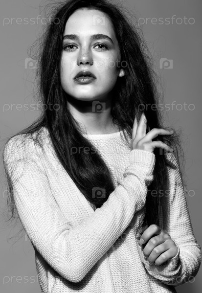 Портрет красивой молодой брюнетки в белом модном женском пуловере